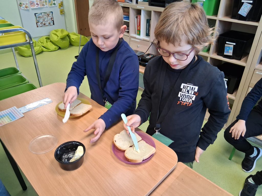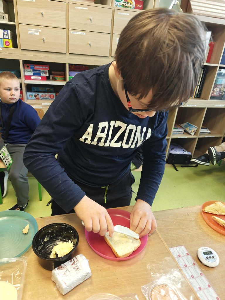 Każdy z uczniów mógł własnoręcznie wykonać swoją kanapkę – od posmarowania kromek chleba masłem, poprzez dobór składników, aż po umieszczenie jej w zapiekaczu. Pod czujnym okiem i z pomocą nauczyciela dzieci obserwowały cały proces przygotowania oraz zapiekania tostów.